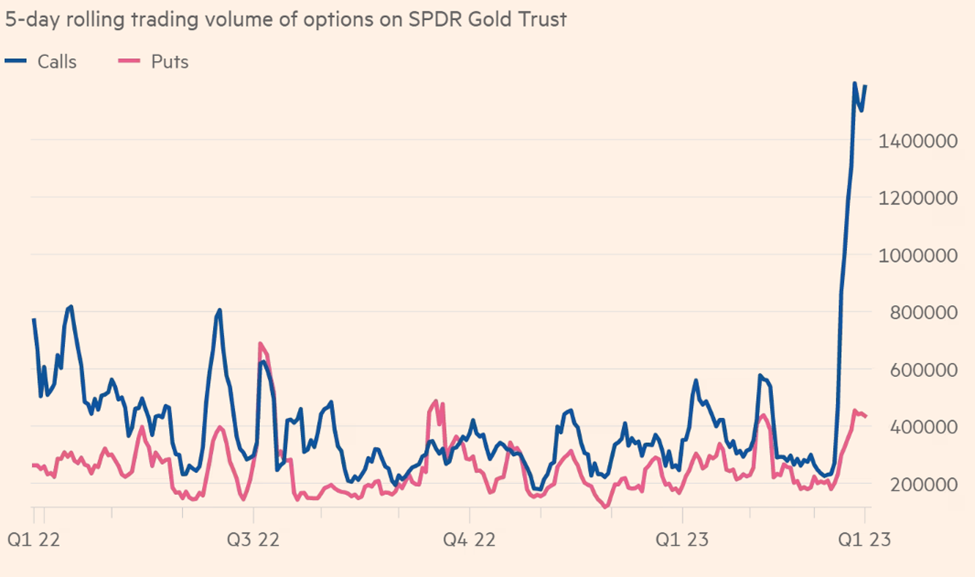 例如,自本月初以来,最受欢迎的黄金支持 ETF SPDR 黄金信托的五天滚动看涨期权数量激增了五倍多(见下图)。芝加哥商品交易所的黄金期货和与之相关的期权也出现了类似的兴趣增长。