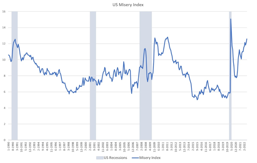As the chart below shows, the Misery Index has risen steeply since July, 2021. In June, 2022, the index hit 12.5, the highest since 2011 when the US economy was experiencing very weak job and economic growth following the financial crisis. June’s figure also rose above the index from the 2007-09 Great Recession, and was just about equal to where it was in the run-up to the 1990-91 recession. (recessions are shown as light blue shaded vertical bars)