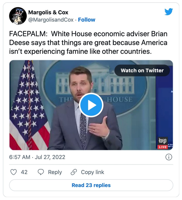 It will probably surprise no-one to learn that the White House is in official denial of these grim statistics. Despite the fact that real wages (wages minus inflation) are going down, the cost of living (inflation) is going up, jobless claims are increasing rapidly, and the savings rate has plummeted, what really matters to the US President and his inner circle is the technical definition of “recession”.