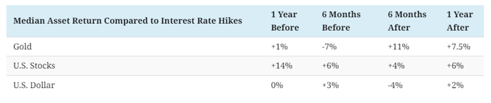 While gold underperforms compared to stocks and the US dollar leading up to rate hikes, past tightening cycles saw gold hit new all-time highs in the 2000s (see graphic below).