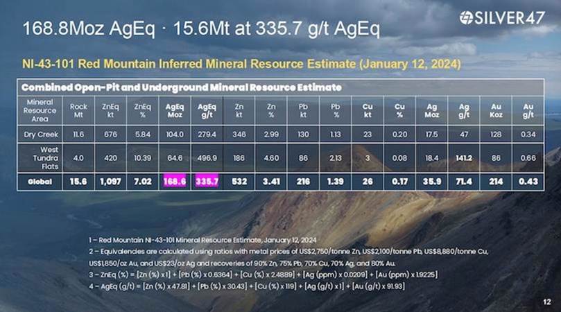 On Jan. 12, 2024, Silver47 came out with a mineral resource estimate for Red Mountain. The combined open-pit/ underground inferred resource amounts to 15.6 million tonnes at 335.7 g/t silver-equivalent (AgEq), containing 168.6Moz AgEq.