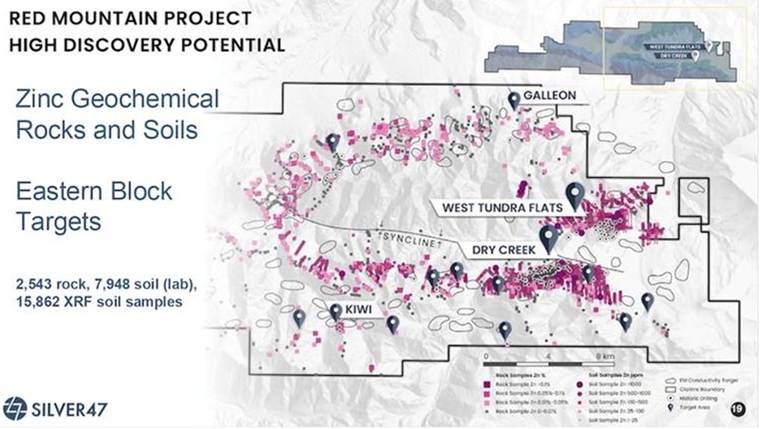 The third priority target is Sheep Creek, also a SEDEX discovery. The strata-bound Ag-Zn-Sn massive sulfide occurrence features rock grabs up to 306 g/t Ag, XRF soils up to 60 g/t Ag, and up to 1.2% Sn (tin) over 2m reported from 1977 drilling. Silver47 is planning to map the area and to conduct dense soil XRF (X-ray fluorescence) to locate the extent of the mineralized horizons, thus aiding drill targeting.