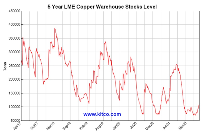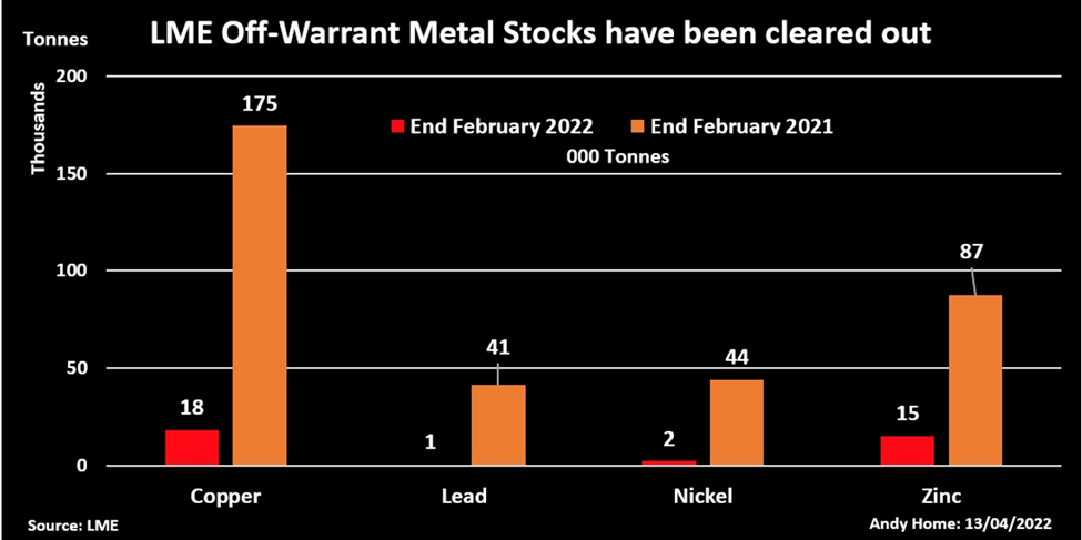 Off-warrant copper inventory collapsed from 175,000t in February 2021 to 18,352t at the end of February this year.