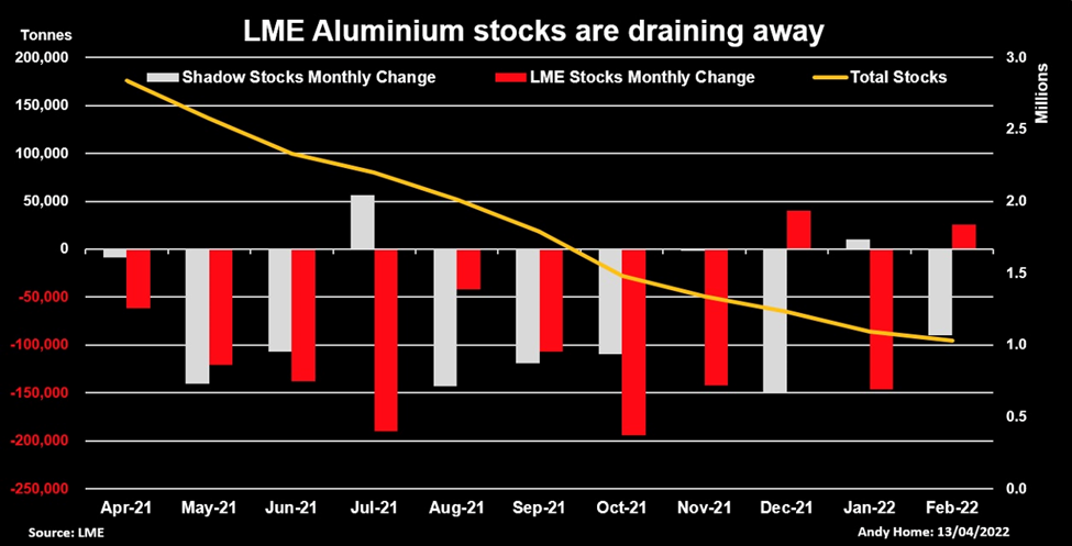 Off-warrant aluminum stocks were at 1.74Mt in February 2021 but a year later they had shrunk to just 218,000t. Home notes the fact that both shadow and registered aluminum stocks have been falling in tandem, is a sign of an under-supplied market.