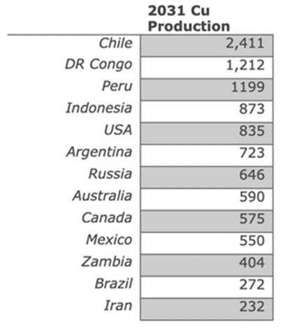 In the table below, CRU provided us with a breakdown of where future (2031) production is located. Notice that Chile tops the list followed by the DRC, Peru and Indonesia.