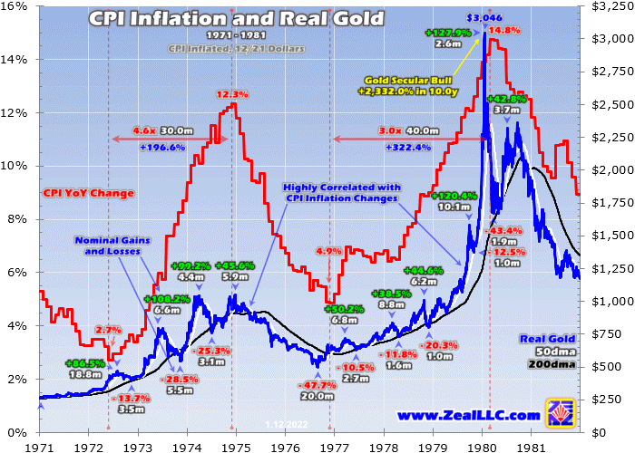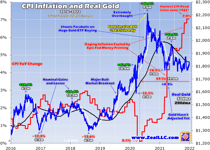 That includes me, a mid-1970s baby. Thus before assuming gold won’t respond to the Fed’s radically-unprecedented monetary excesses of the last couple years, it is prudent to see how gold fared the last time inflation ran this hot. So this next chart applies this same headline-CPI-YoY and CPI-adjusted-real-gold methodology to the 1970s. Gold has a long track record of incredible performance in inflationary times!