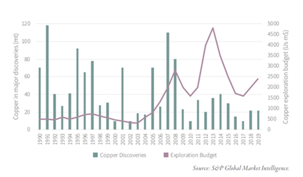 A dearth of new copper discoveries and capital spending on mine development in recent years means that once an existing mine becomes exhausted, its output may not be replaced in time to meet the growing demand.