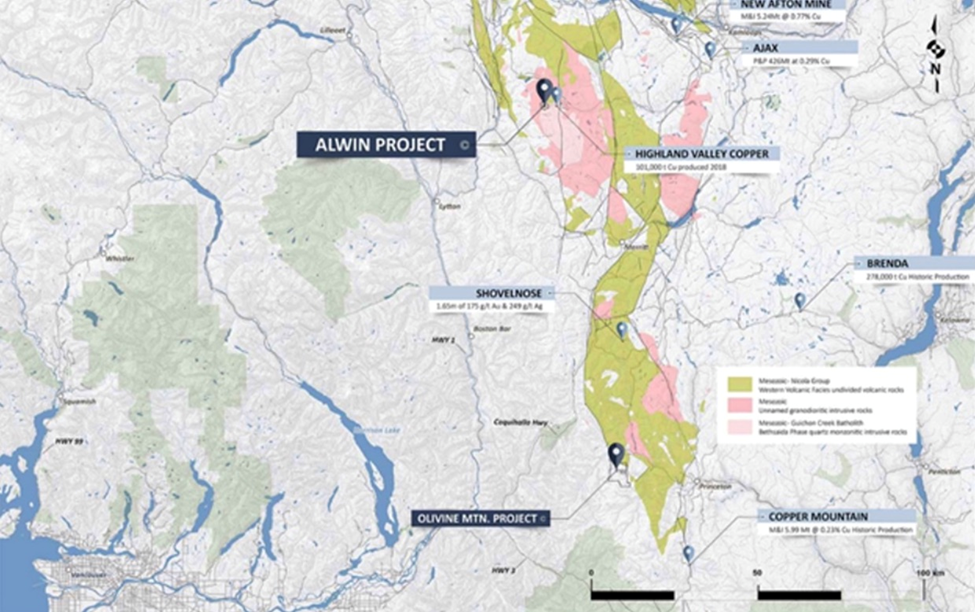 The Alwin Mine Project is 18 km from the town of Logan Lake, southwest of the New Afton and Ajax mines, and less than a kilometer from the Highland Valley copper mine owned and operated by Teck Resource Corp.
