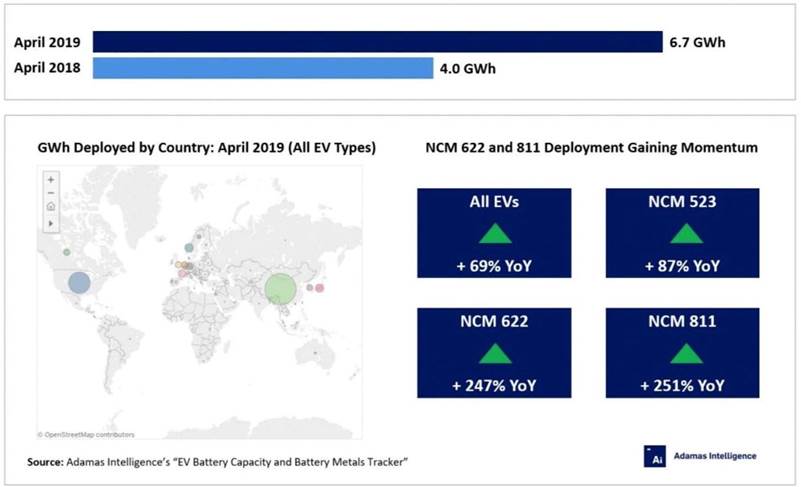 The CAGR of NMC 811s has been phenomenal. According to Adamas Intelligence’s EV Battery Capacity and Battery Metals Tracker, in April 2019 the NMC 811 cathode chemistry saw a 251% increase in deployment year over year. Despite holding just 1% of the passenger EV market by gigawatt hour deployed (GWh), 811s are expected to rise further in coming months due to the release of the Nio ES6 battery electric vehicle (BEV) and the GAC Aion S BEV, both equipped with NMC 811 battery cells from China’s CATL, the largest EV battery manufacturer in the world.