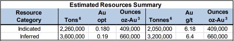 Metal price for the Mineral Resource estimates was $1,225 per ounce Au, the trailing three year average on December 31, 2016. The minimum reporting cut-off was 0.10 opt Au (3.43 g/t), over a minimum horizontal width of 6 ft (1.8m). Mineral Resources which are not Mineral Reserves do not have demonstrated economic viability.