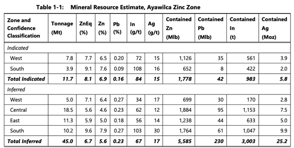 Two holes at South Ayawilca intersected high grade zinc-silver mineralization associated with massive sulfide mineralization over substantial widths and are expected to expand the indicated mineral resource.