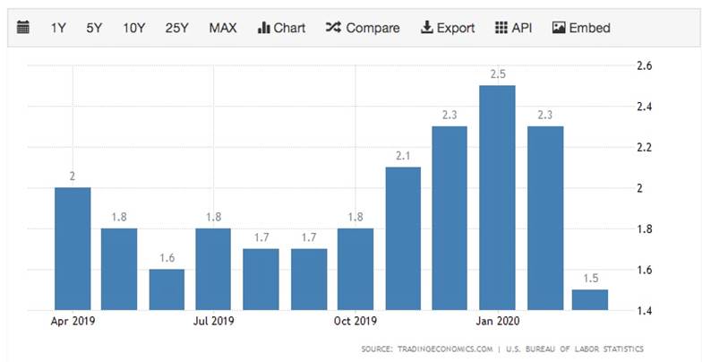 Their frozen spending is reflected in falling prices, ie. deflation. In January US inflation was 2.5%, in February 2.3%, and in March, when covid-19 hit the United States, inflation sunk to 1.5%.
