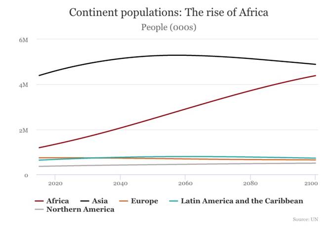According to the Center for International Policy, in 2035 the number of working-age people in Africa will exceed the rest of the world combined, and by 2050 one in four humans will be African. At 2100, 40% of the world’s population will hold a passport from an African country.