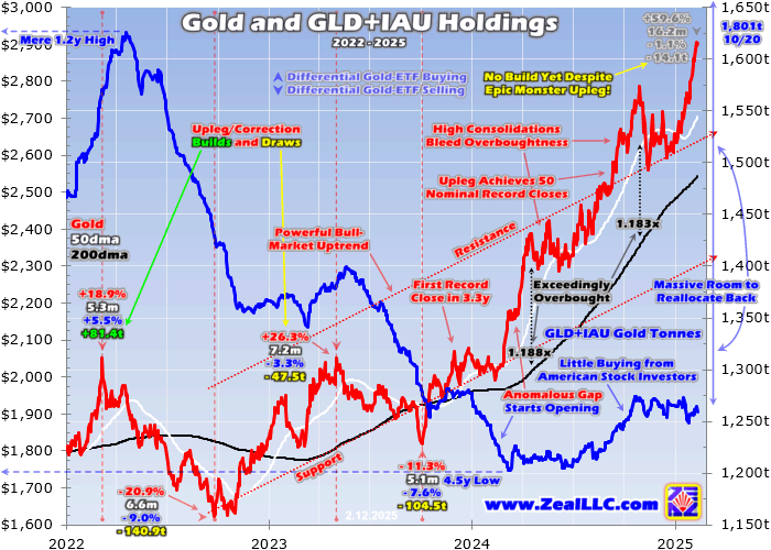 Those last two 40%+ monster gold uplegs cresting in 2020 averaged 387t GLD+IAU-holdings builds to fuel them. So American stock investors could easily do enough differential gold-ETF-share buying again to force another 400t-ish build. Incredibly that would merely return GLD+IAU holdings to 1,660t, not much higher than April 2022 levels when gold was just near $1,950! The all-time high was 1,801t in October 2020.