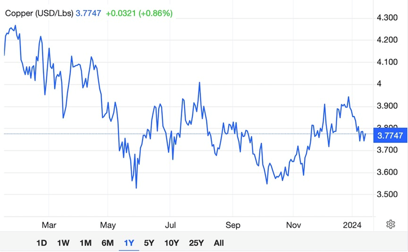 However, a couple of factors identified by us at AOTH indicate that 2024 will be much better for copper, with the metal potentially knocking on the door of $4 or higher. Most important is supply failing to keep up with demand. The second factor is a weakening of the US dollar if market expectations of monetary easing come to pass.
