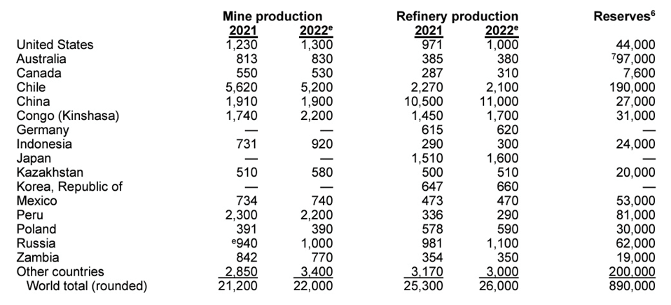So far the amount of copper required is do-able — 10,000 tonnes is 130 times less than the amount of copper produced by the US in 2022 and 520x less than the copper mined by top producer Chile.