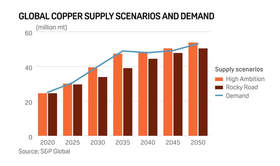 To achieve net-zero emissions targets, annual copper demand is likely to double to 50 million tonnes by 2035, according to a study by S&P Global. How much red metal actually becomes available is seriously in doubt, as we have outlined in the sections above.