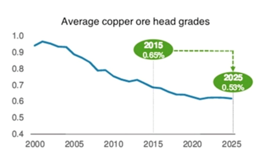 Average copper ore head grades have fallen substantially since 2015 and will continue to trend lower as the chart below shows.
