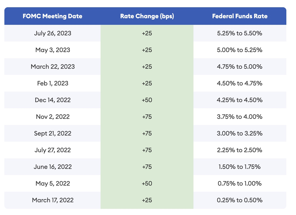 Since March, 2022, the Fed has been working to control inflation that at one point was the highest in 40 years. They’ve been doing this by raising interest rates in increments from essentially zero to +5%. In June the Fed paused its rate-hiking but on July 26, they raised the federal funds rate another quarter percentage point, to 5.5%. No more rate increases occurred over the next three monthly meetings.