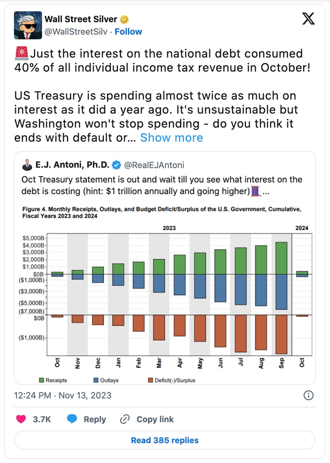 According to Citizen Watch Report, interest payments on the national debt used up 40% of all the money collected from individual income taxes in October. The US Treasury is now spending almost twice as much on interest as compared to the previous year.