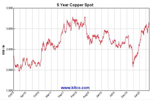 As of this writing spot copper is trading at $3.08 per pound, compared to around $2.10/lb in mid-March – a gain of 46%. The spot price has stayed above $3.00 since Oct. 8 – which is remarkable considering the reports of impending economic doom, amid a second wave of covid-19 infections in Europe and North America.