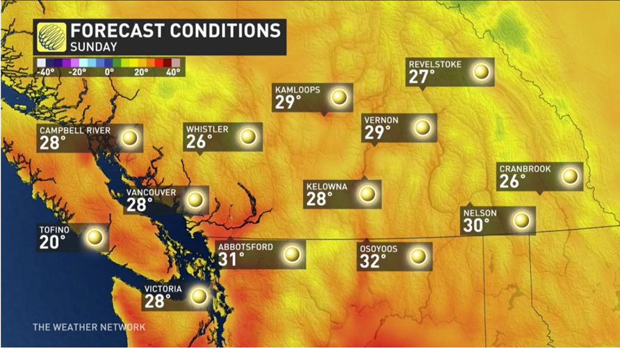 An offshore flow will allow temperatures to reach the mid-to-upper 20s along the South Coast, possibly reaching the 30-degree mark for downtown Vancouver, and into at least the low-to- mid-30s for some inland locations, including the Fraser and the Okanagan valleys…