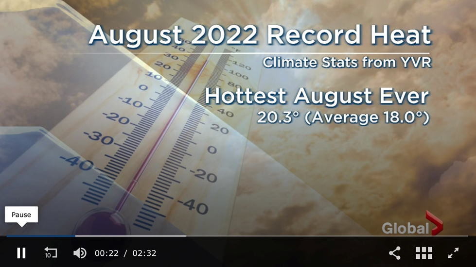 Global News reported on Friday, Sept. 2 that August 2022 was the warmest ever in BC, and the province’s second-hottest month, based on temperatures taken at Vancouver Airport.