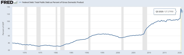 As the chart below shows, the federal debt to GDP ratio as of Dec. 22, 2020, was 127.2%. The amount borrowed by the federal government has now exceeded the size of the economy.