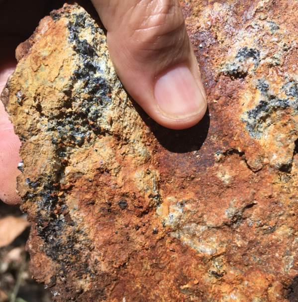 The La Gloria mine was developed on one of many exposed northwest-trending veins. Gold mineralization occurs in a structural zone characterized by 10-20% red chalcedonic quartz hematite veinlets that contain minor bright green zinc-copper oxides and hematite stain.