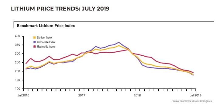 Reuters reports, Converters of hard rock lithium into battery chemicals in China were holding around four months’ worth of stocks, or double usual levels… This has slowed sales from overseas suppliers. Galaxy sold 44,630 tonnes in the first half of 2019, against more than 90,000 tonnes a year earlier, at an average price of $584, down from $940 a year ago.