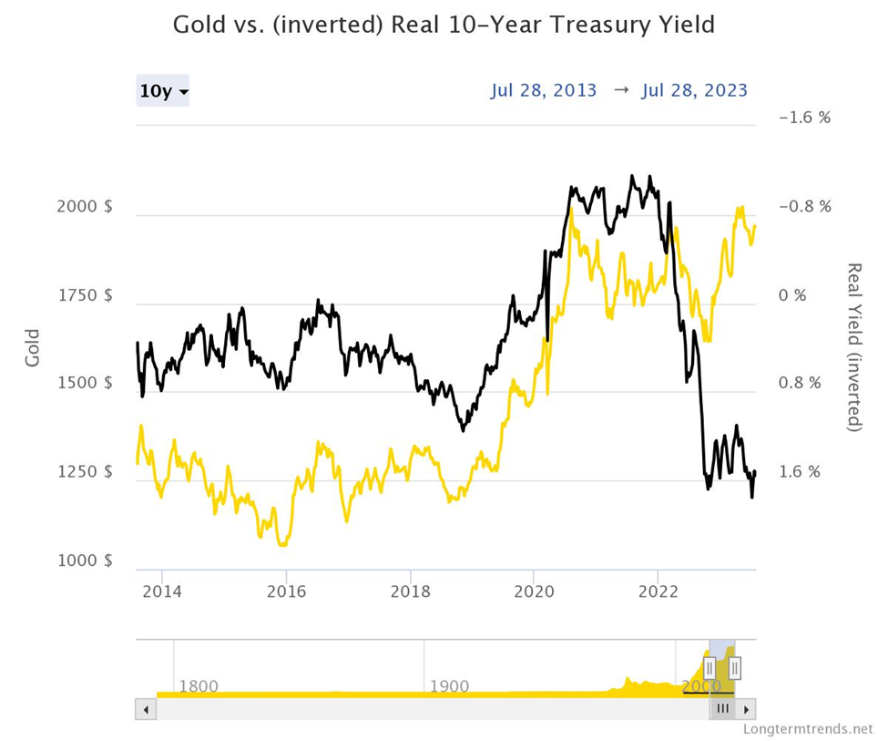 While such a move didn’t come as a shock to most people, it did bring us closer to peak interest rates — and eventually, a Fed pivot — which is positive news for gold. This is because when the US central bank reverses its policy, it tends to weaken both the dollar and yields, both of which are rival assets to gold.