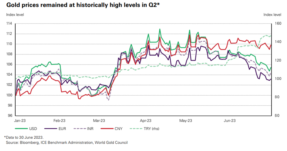 This week, the World Gold Council (WGC) put out a fresh quarterly report confirming the metal’s demand trajectory. In Q2 2023, gold investment in Q2 was healthy compared with the same quarter of last year, up 20% to 256t. Jewelry consumption also strengthened modestly y/y, up 3% to 476t despite historically high (if not record) prices in most markets.