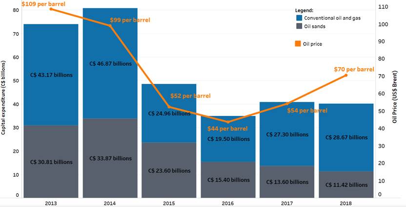 According to the Canadian Association of Petroleum Producers, capital spending in the oil and natural gas industry will fall to $37 billion in 2019 compared with $81 billion in 2014.