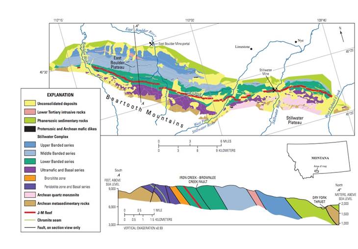 A similar geological cross-section is displayed in the next image, of the Stillwater Complex. Notice the red line running along the edge of the Beartooth Mountains. This is the J-M Reef.