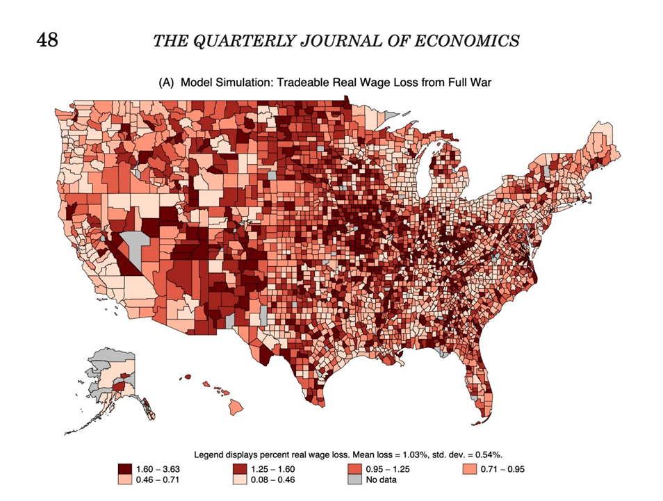 The resulting losses to U.S. consumers and firms that buy imports was $51 billion, or 0.27% of GDP. We embed the estimated trade elasticities in a general-equilibrium model of the U.S. economy. After accounting for tariff revenue and gains to domestic producers, the aggregate real income loss was $7.2 billion, or 0.04% of GDP. Import tariffs favored sectors concentrated in politically competitive counties, and the model implies that tradeable-sector workers in heavily Republican counties were the most negatively affected due to the retaliatory tariffs.