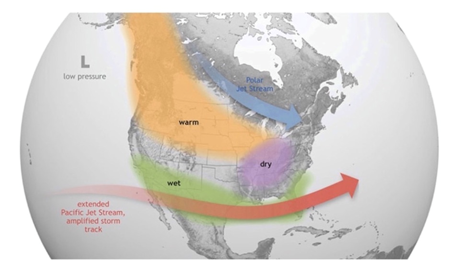 During winter, this leads to wetter conditions than usual in the southern US and warmer, drier conditions in Canada.