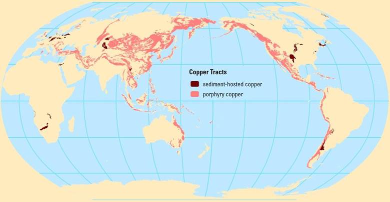 According to the US Geological Survey, three-quarters of the world’s identified copper resources are porphyry deposits (see map below), some of which may contain tens of billions of ore even after operating for several years like Chile’s massive Escondida mine.