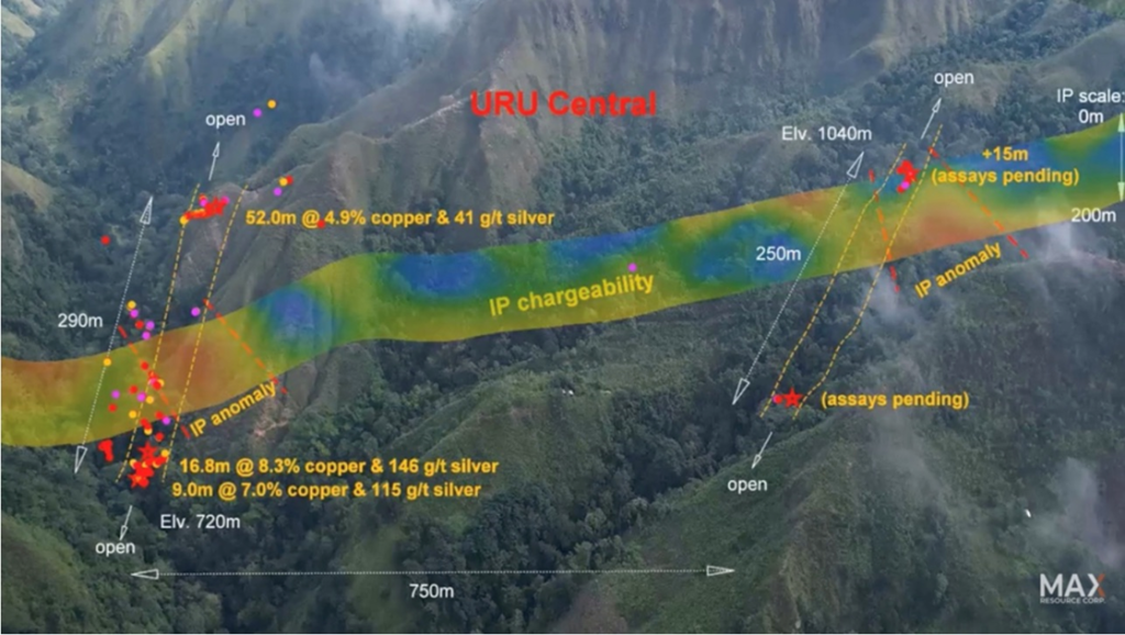 First, the Max field team conducted an IP survey at URU so that they could see in three dimensions what the mineralization looks like before they start drilling it. Because the primary copper mineral is highly conductive chalcocite, it lights up nicely on an IP geophysical survey. The next step for Max after doing IP at URU, is to drill. According to Max, the IP chargeability on the survey correlates with two copper-silver rich discoveries at “URU Central” that extend at least 200m below surface. The first two drill targets are “URU-C” and “URU-CE”.