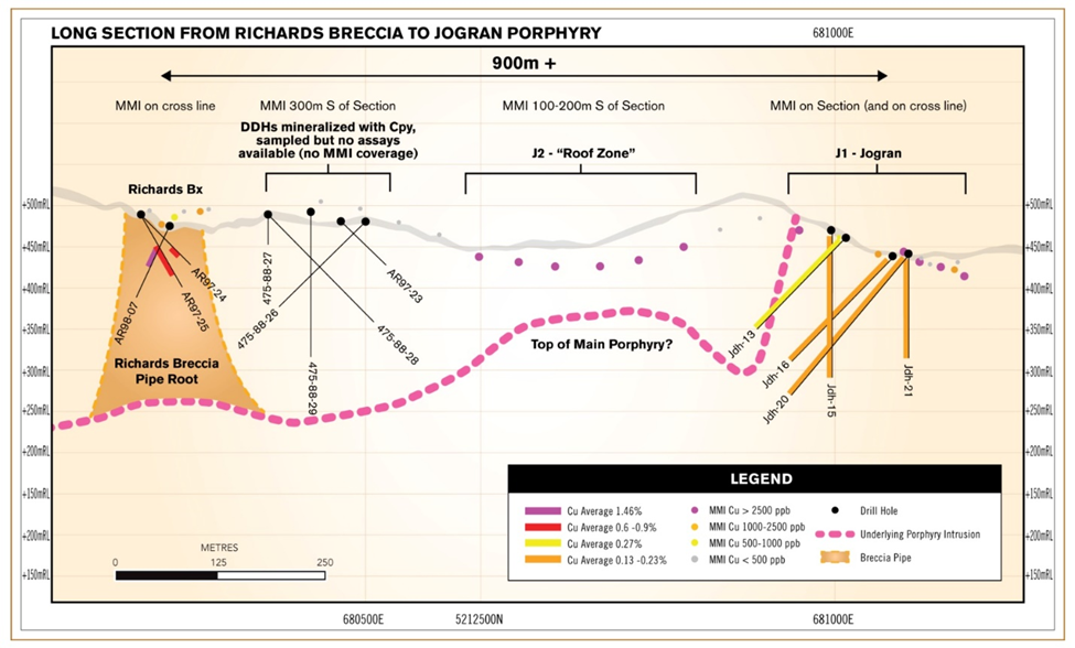 “The JR Zone contains lengthy intersections of near-surface breccia and porphyry-hosted mineralization that are untested at depth and untested for byproduct minerals. Confirmatory MMI lines and historical geophysics demonstrate the potential for a larger zone of mineralization at the Jogran porphyry and additional larger breccia targets to the northwest and to the south of the Richards breccia,” said Copper Road Resources President and CEO John Timmons. He added, “We are confident that our proposed summer exploration program will demonstrate the potential of the JR Zone to host a large-tonnage near-surface copper deposit containing a suite of byproduct minerals.”