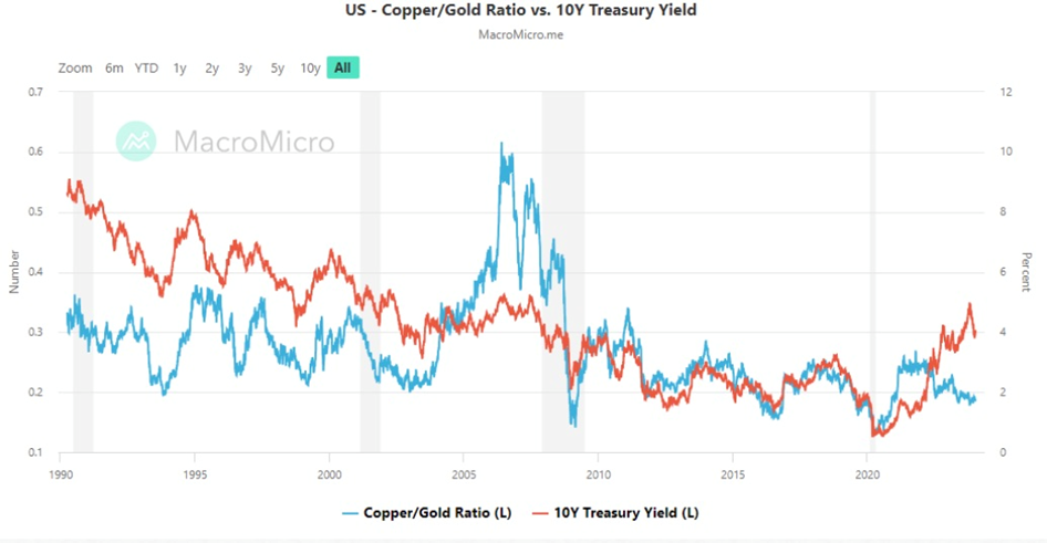 Historically, when the copper-gold ratio and the 10-year yield diverge, the 10-year tends to follow the ratio. For example in the third quarter of 2022, yields moved higher while the copper-gold ratio moved lower.