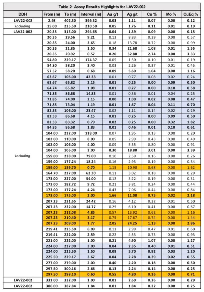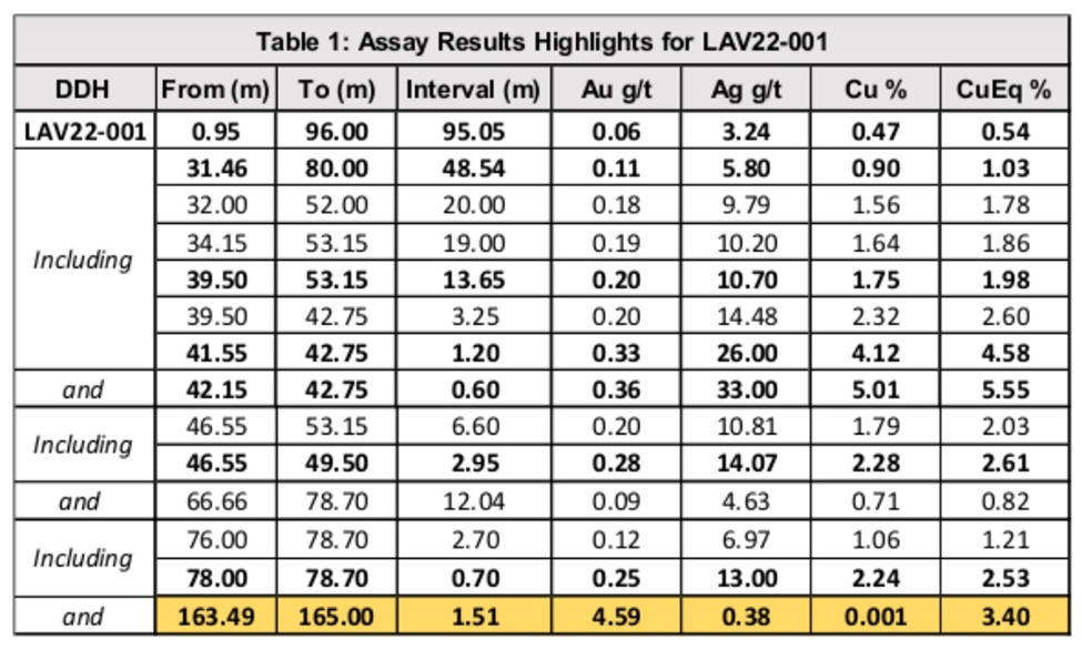 Hole LAV22-001 was drilled to the east for 268 meters and intersected 48.5m of 1.03% copper equivalent (CuEq) (0.90% Cu, 5.80g/t Ag, 0.11g/t Au) within 95.05m of 0.54% CuEq (0.47% Cu, 3.24g/t Ag, 0.06g/t Au) from surface, confirming the presence of a significant high-grade copper and associated gold skarn.