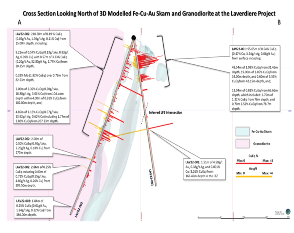“These results have confirmed and over exceeded our expectations — especially when considering the shear-hosted gold hit within the LFZ. High-grade copper skarn and endoskarn occurrences extending from surface to over 200 metres depth reside in contact with a locally intensely potassic altered and mineralized causative intrusion at Laverdiere, that boasts a large resistive geophysical signature and remains open for exploration. Drilling completed to-date has only begun to scratch the surface and indicates the presence of a potentially large porphyry system. We look forward to receiving the remaining assay results at Laverdiere and planning a more aggressive diamond drilling program for 2023.”