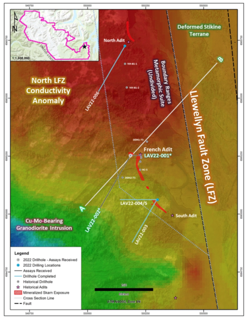 Assays are pending for holes LAV22-003 to LAV22-006, all of which intersected similar high-temperature skarn and porphyry-style mineralization, veining and alteration spanning an 850m strike length.