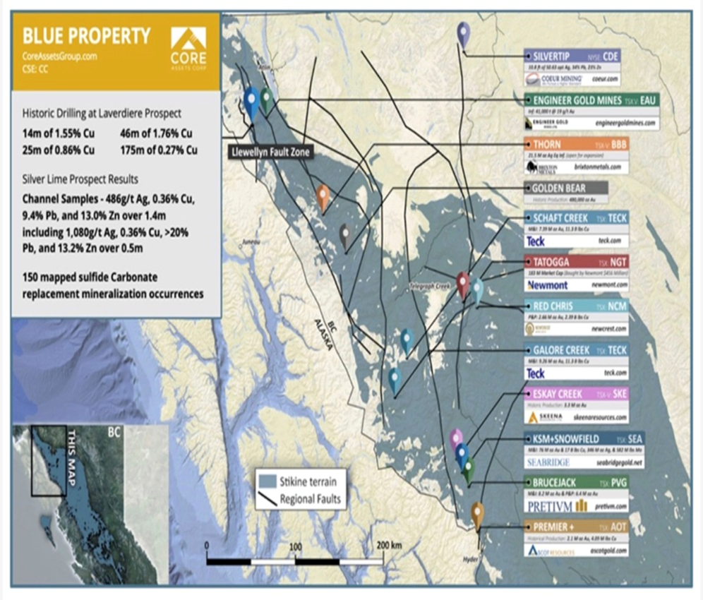 Carbonate replacement deposits (CRD) feature prominently in this region, including Core Assets’ Blue property.