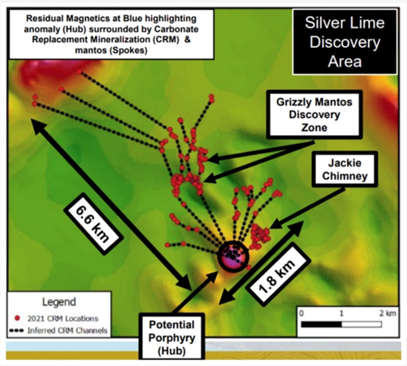 Within this area, the surface channel assays from a maiden sampling campaign at Silver Lime, have confirmed high-grade carbonate replacement mineralization (CRM).