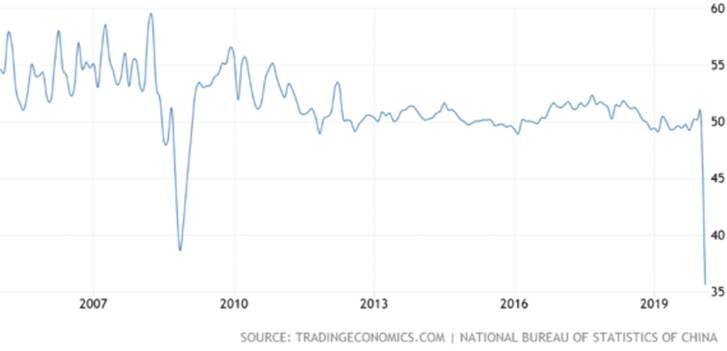 Over the weekend China’s PMI manufacturing data sunk to 35.7 (the services PMI was even worse at 28.9), against expectations of 45. (PMIs under 50 represent an economic contraction)
