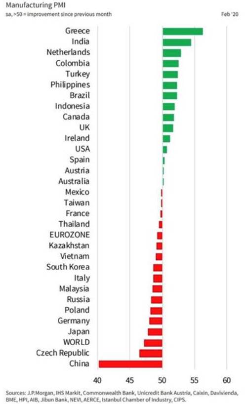 PMIs not only in China have been seriously whacked due to the virus’ impact on supply chains. According to Zero Hedge the global manufacturing sector has suffered its steepest contraction since 2009. Out of 31 nations for which data was available, 15 saw their output contract. They include China, Japan, Germany, France, Italy, South Korea and Australia.