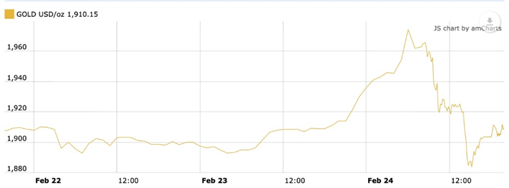 Of course gold is always in the mix during times of geopolitical stress. On Thursday, Feb. 24, spot gold came within $26 of $2,000 an ounce, before slipping back as supposedly more hefty sanctions were announced.