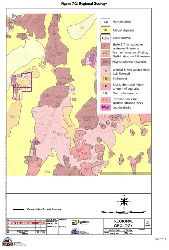 According to earlier (1979, 1986, 2011 and 2013) geological descriptions of the Clayton Valley and summarized in the PEA, “Multiple wetting and drying periods during the Pleistocene [period] resulted in the formation of lacustrine deposits, salt beds, and lithium-rich brines in the Clayton Valley basin. Extensive diagenetic alteration of vitric material to zeolites and clay minerals has taken place in the tuffaceous sandstone and shale of the Esmeralda Formation, and anomalously high lithium concentrations accompany the alteration… These tuffaceous lacustrine facies of the Esmeralda Formation contain up to 1,300 parts per million (ppm) lithium and an average of 100 ppm lithium (Kunasz, 1974; Davis, et al., 1979). Lithium bearing clays in the surface playa sediments contain from 350 to 1,171 ppm lithium (Kunasz, 1974).” (see map below)