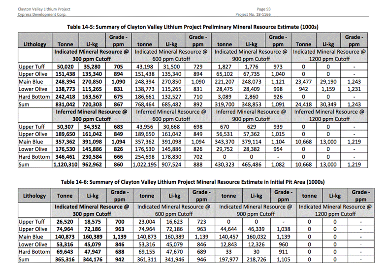 The IRR is all the more impressive considering that Cypress only spent a million dollars in exploration to achieve the numbers in the report. What’s more, the resource increased significantly from the original estimate released in June. The Clayton Valley Lithium Project now hosts a combined indicated and inferred resource of 8.9 million tonnes of lithium equivalent (LCE), which is 2.5 million tonnes more than previously reported. This breaks down to 3.835 million tonnes of LCE in the indicated category, and 5.126 million tonnes of LCE in the inferred category. The grades in the PEA are only slightly different, at 867 parts per million (ppm) indicated and 860 ppm inferred, versus the June resource estimate’s 889 and 888 ppm.